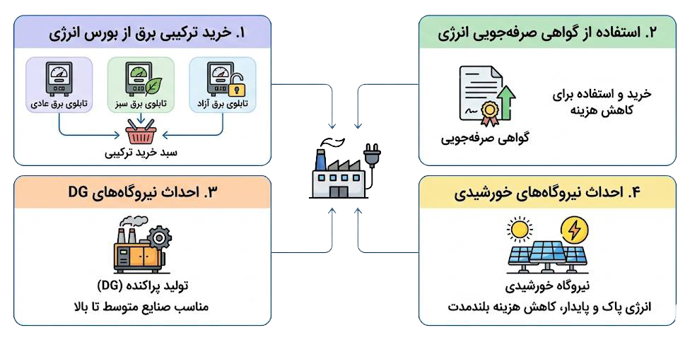- خرید ترکیبی از تابلوی برق عادی، تابلوی برق سبز و تابلوی برق آزاد از طریق بورس انرژی یا قراردادهای دوجانبه
